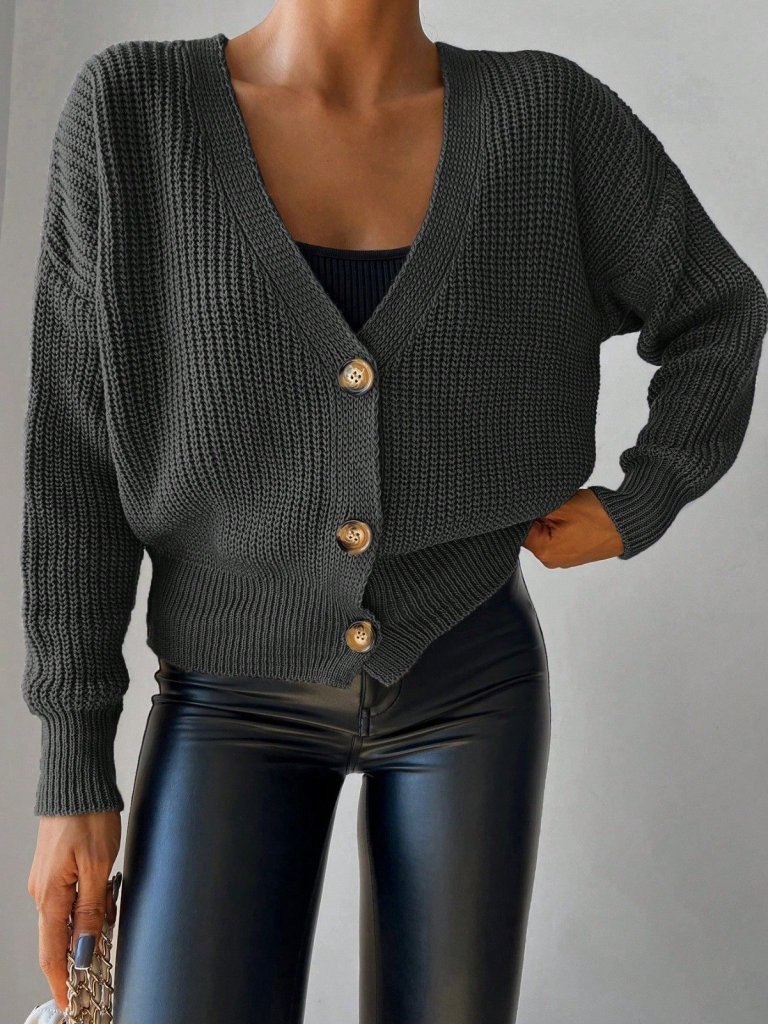 Ζακέτα σε πλέξη ριμπ με άνοιγμα V, κουμπιά μπροστά, χαμηλή μανικοκόλληση και μακρύ μανίκι.Είναι one size και προσαρμόζεται εύκολα σε κάθε σωματότυπο.
