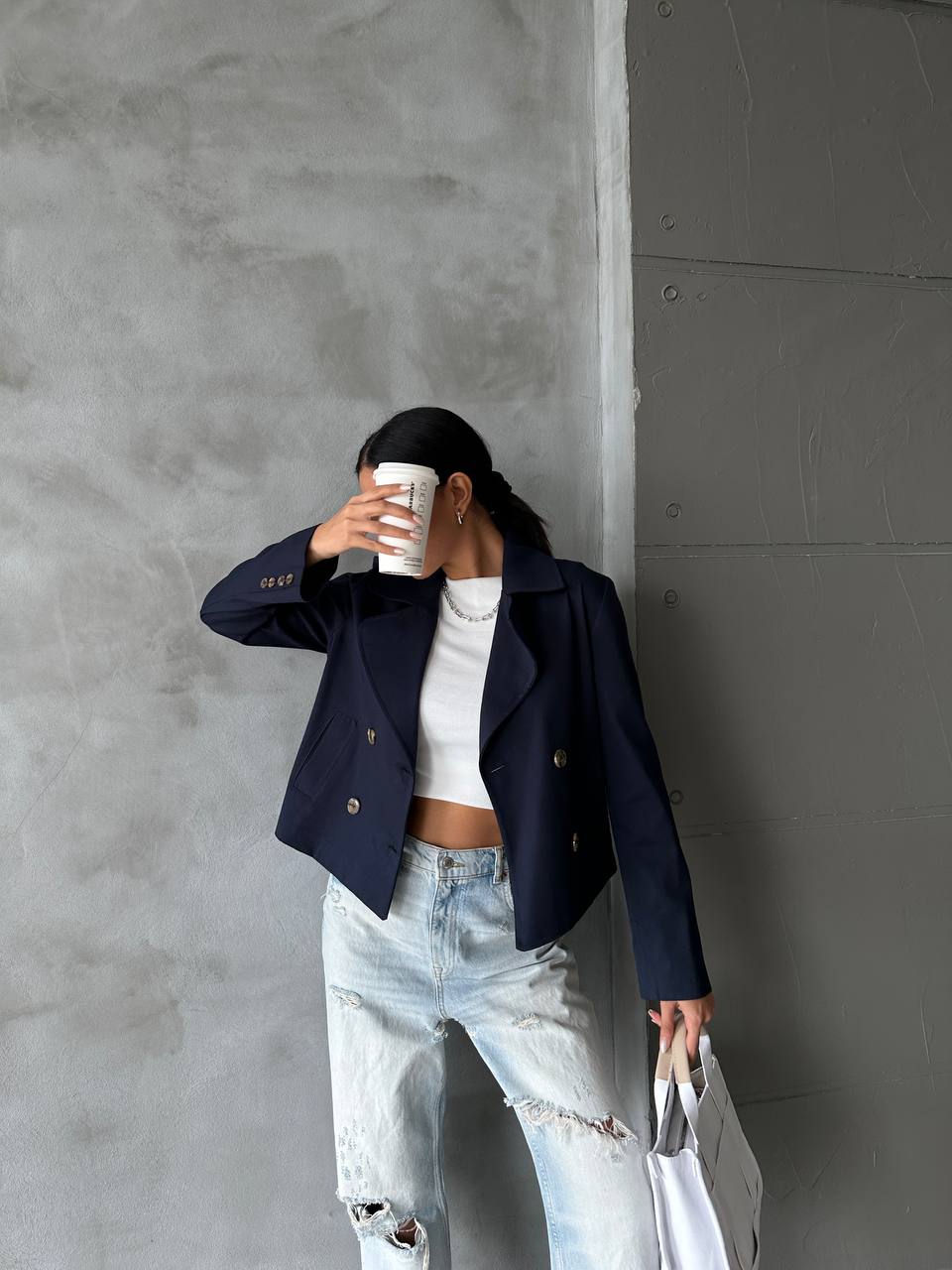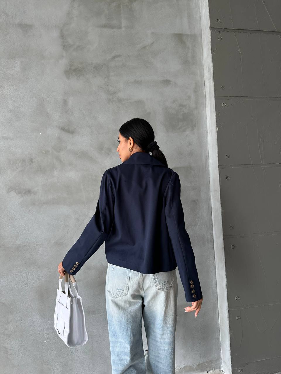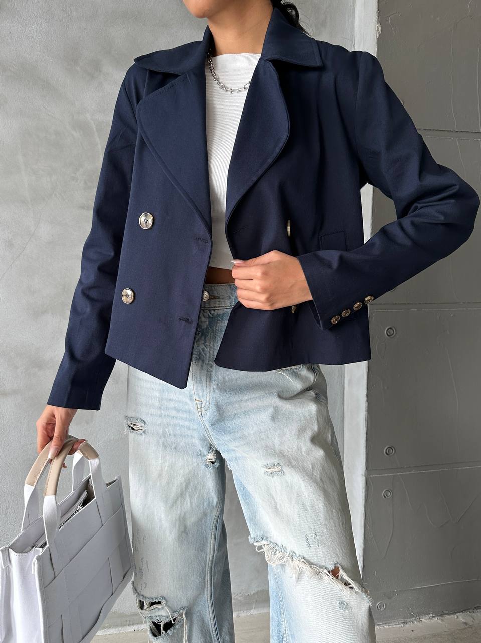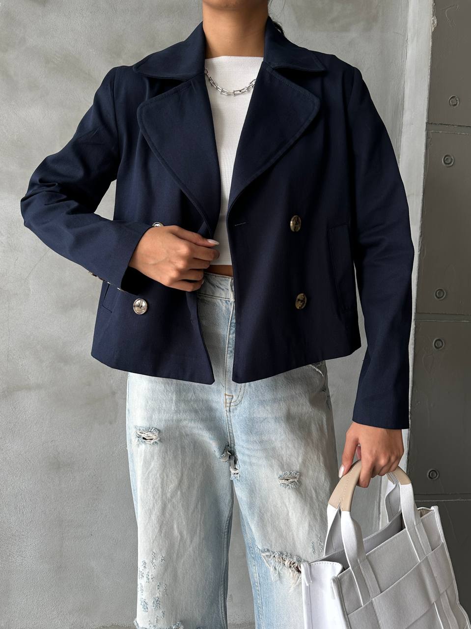 Κοντή καμπαρντίνα με γιακά με μακριά μανίκια με κουμπιά.Είναι απο βαμβακερό πολύ λεπτό ύφασμα.Σταυρωτό κλείσιμο μπροστά με κουμπιά.