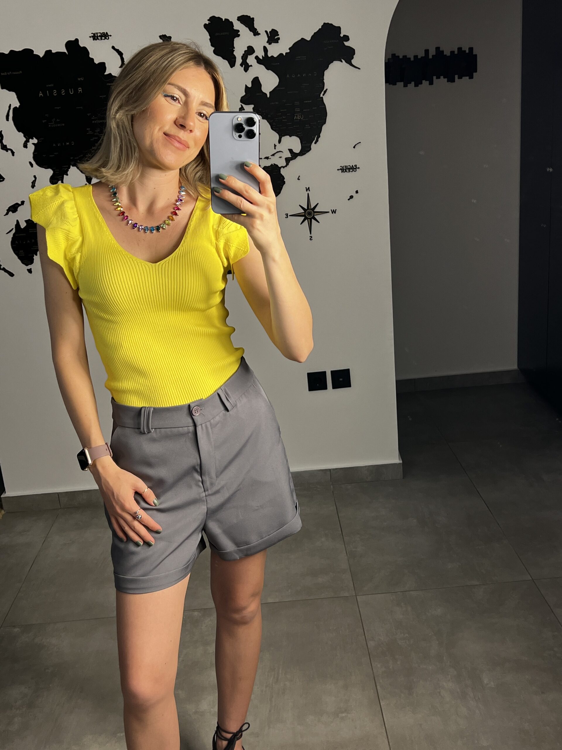 Κοντομάνικο πλεκτό μπλουζάκι με λεπτομέρεια στο μανίκι – Κίτρινο