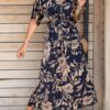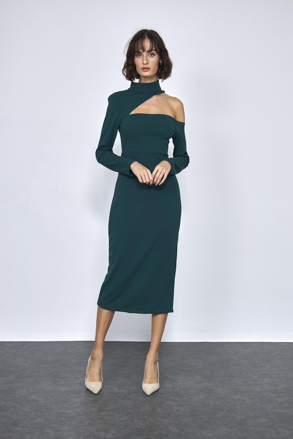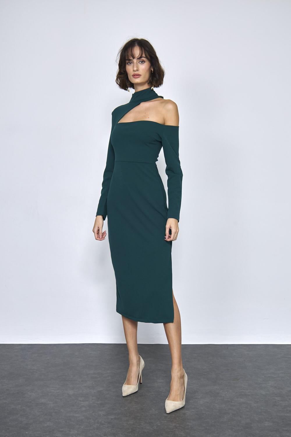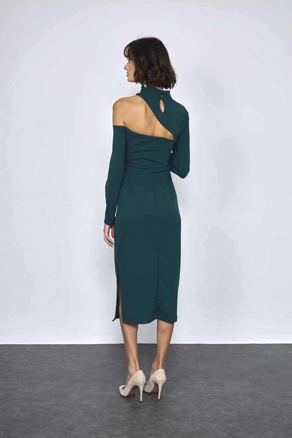 Μίντι μακρυμάνικο ζιβάγκο φόρεμα με μεγάλο άνοιγμα το οποίο συνεχίζεται και στην πλάτη.Κουμπώνει με δυο κουμπάκια.Είναι εφαρμοστό και έχει σκίσιμο στο ένα πόδι.Τα νούμερα έχουν κανονική εφαρμογή.