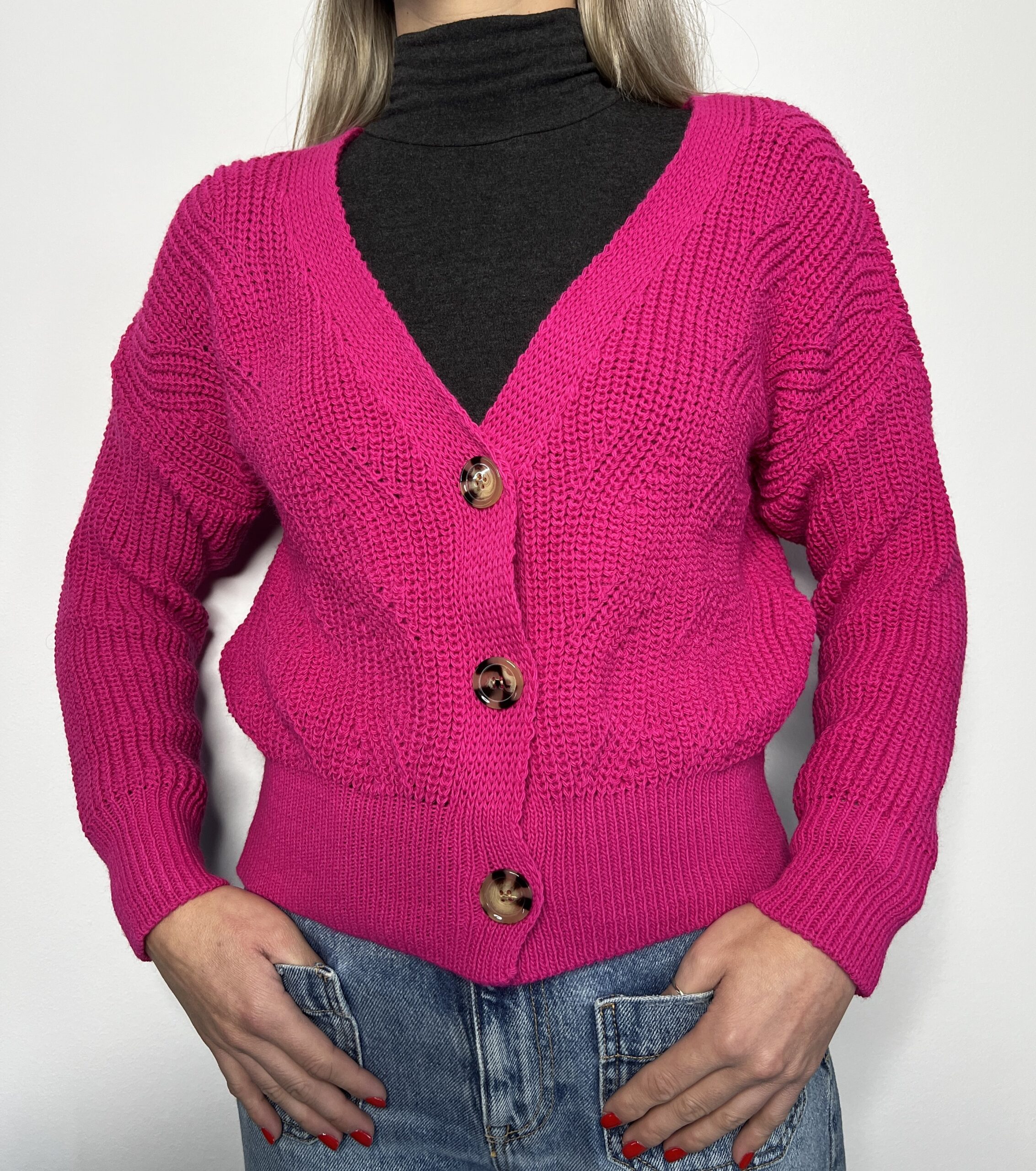 Ζακέτα σε πλέξη ριμπ με άνοιγμα V, κουμπιά μπροστά, χαμηλή μανικοκόλληση και μακρύ μανίκι.Είναι one size και προσαρμόζεται εύκολα σε κάθε σωματότυπο.