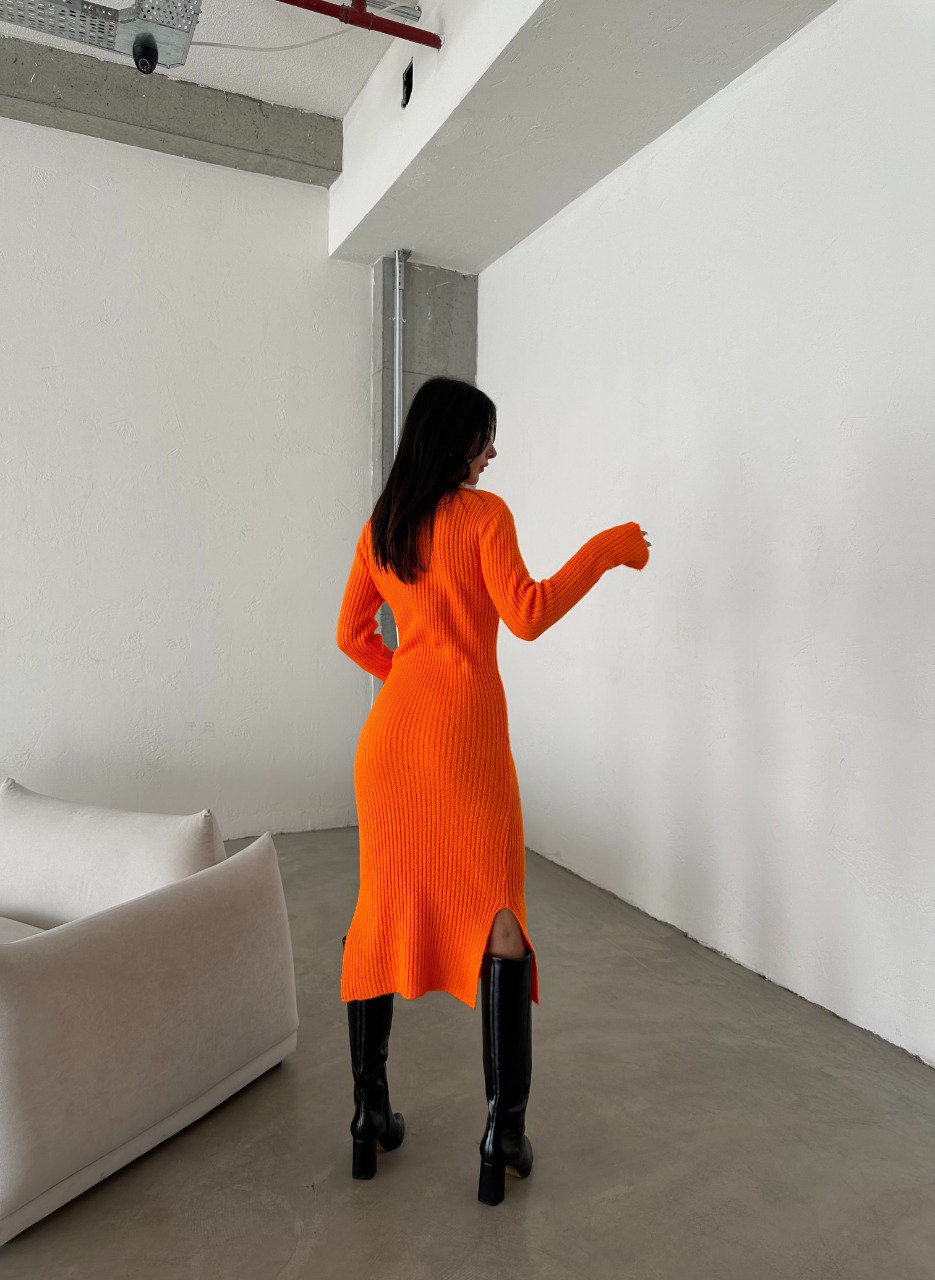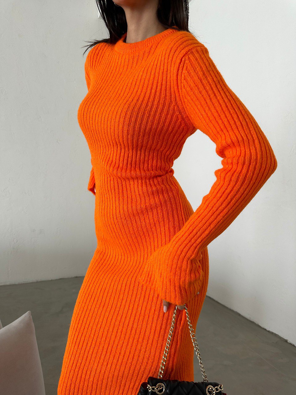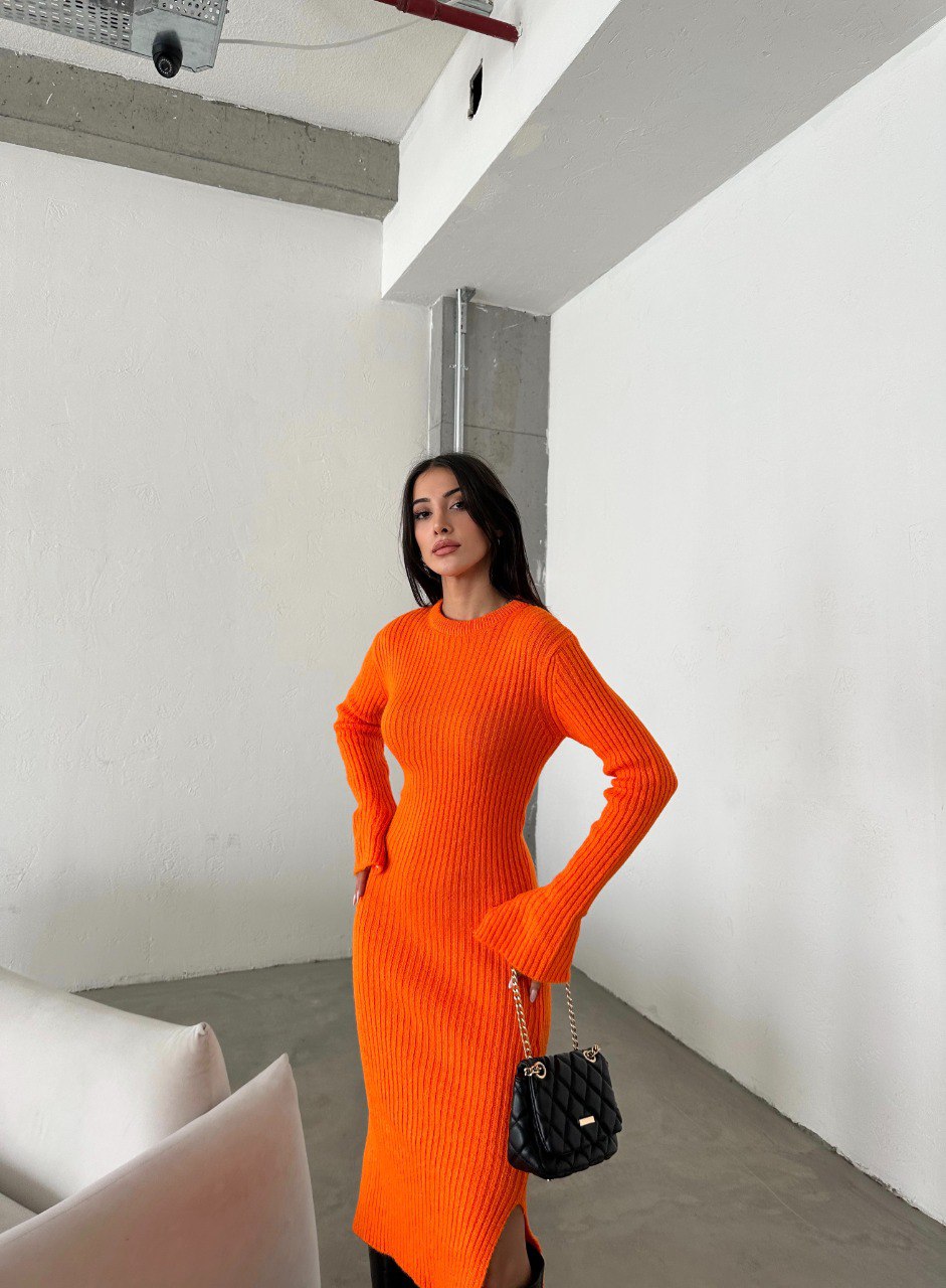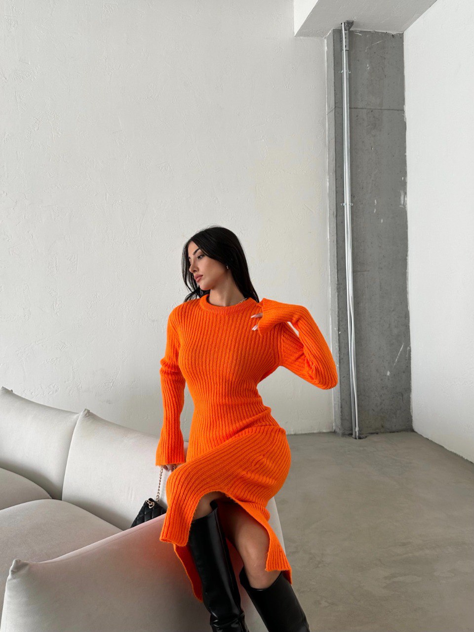 Μίντι φόρεμα με απαλή πλέξη ριμπ.Ντεκολτέ σε σχήμα χαμόγελο και μακρύ μανίκι εβαζε με ανοιγμα στο κάτω μέρος. Ίσιο τελείωμα με σκίσιμο στο πλάι.Πολύ άνετο και ζεστό.