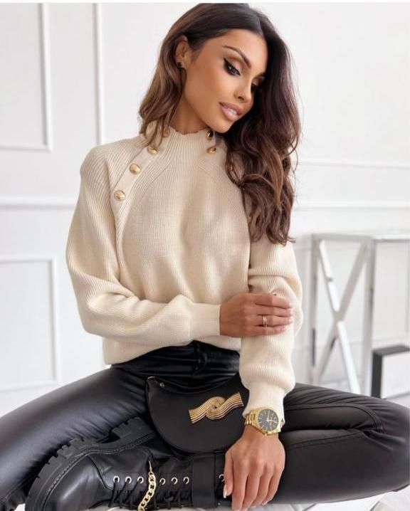 Πουλόβερ με λεπτή πλέξη.Ριμπ λαιμός ζιβάγκο με κουμπιά και απο τις δυο πλευρές και μακρύ μανίκι.Ριμπ μανσέτα και τελείωμα.