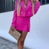 Μπλέιζερ με γιακά με πέτο με εγκοπή και μακριά μανίκια.Κλείσιμο μπροστά με κουμπιά και τσέπες με καπάκι.Ψηλόμεσο παντελόνι με φαρδύ μπατζάκι. Κλείσιμο μπροστά με φερμουάρ, εσωτερικό κουμπί και μεταλλική κόπιτσα.