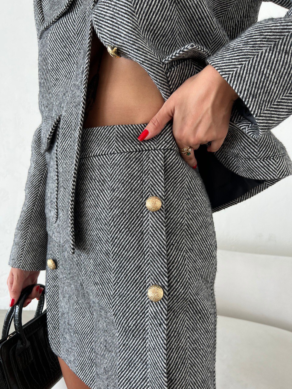 Σακάκι χωρίς γιακά τύπου Chanel με χρυσά κουμπιά και διπλές τσέπες και μίνι φούστα με χρυσά κουμπιά στο πλάι και αριστερά και δεξιά.
