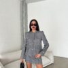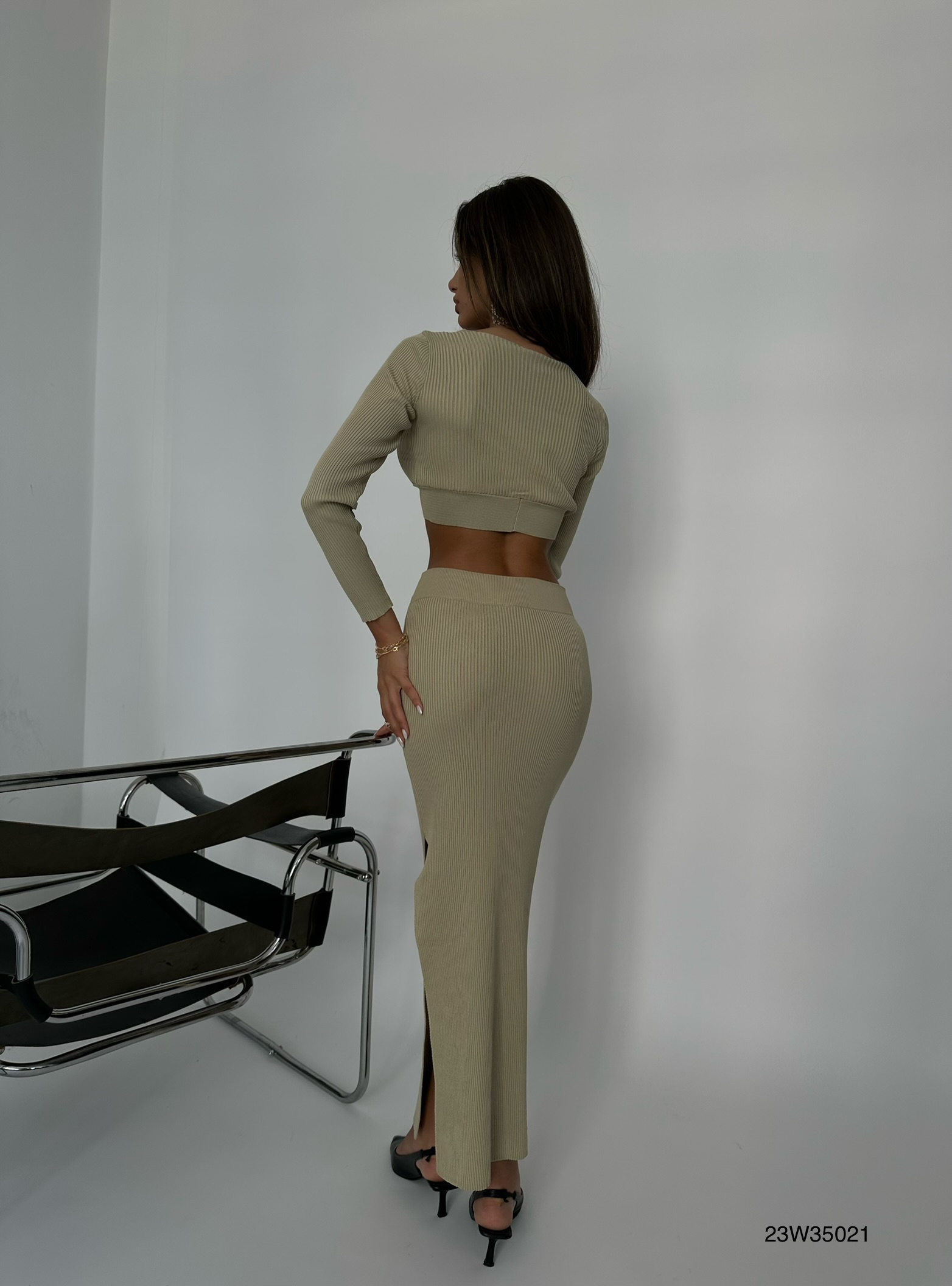 Κοντό εφαρμοστό μακρυμάνικο τοπ με πλέξη ριμπ, V ντεκολτέ και  εφαρμοστή φούστα μέχρι τον αστράγαλο με πλέξη ριμπ και σκίσιμο στο πλάι,έχει ψηλή μέση και κρυφό λάστιχο.