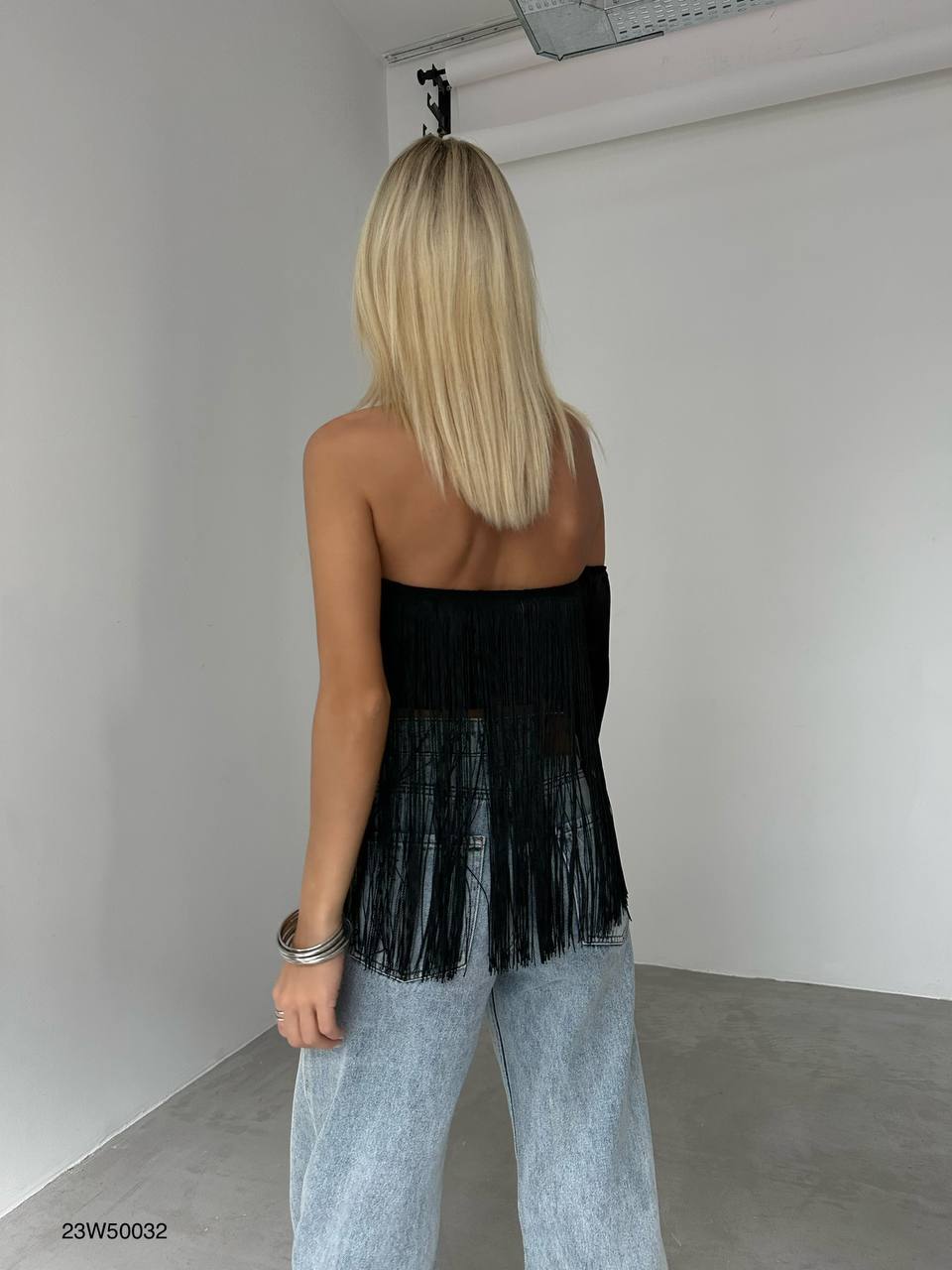 Κοντό τοπ – στράπλες με κρόσια.Έχει στενή εφαρμογή.
