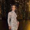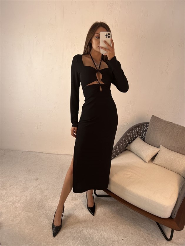 Μίντι μακρυμάνικο στενό φόρεμα με ανοίγματα στο στήθος και κάτω που ρυθμίζονται με κορδόνι.Έχει μεγάλο σκίσιμο στο πόδι.