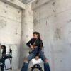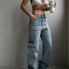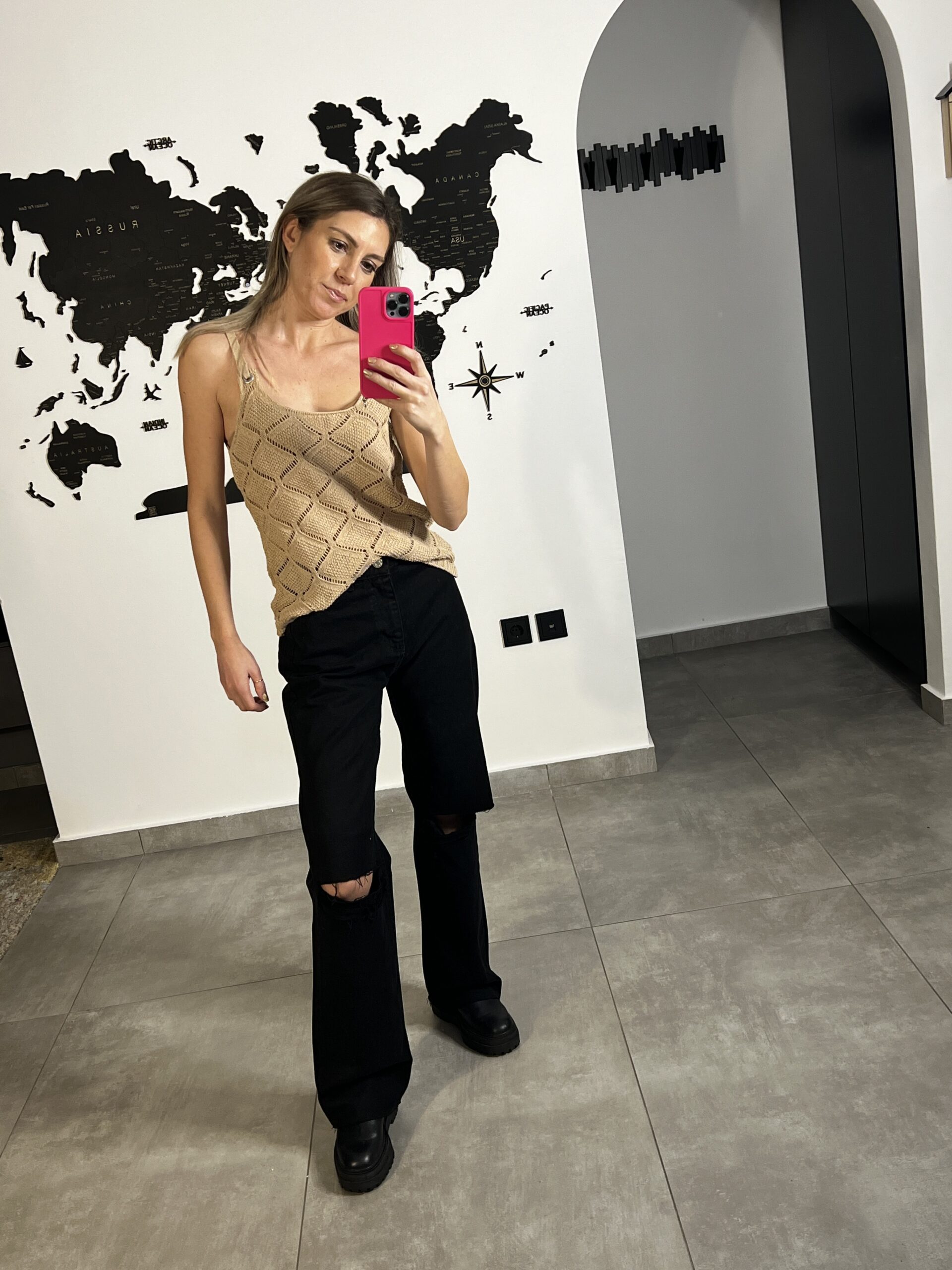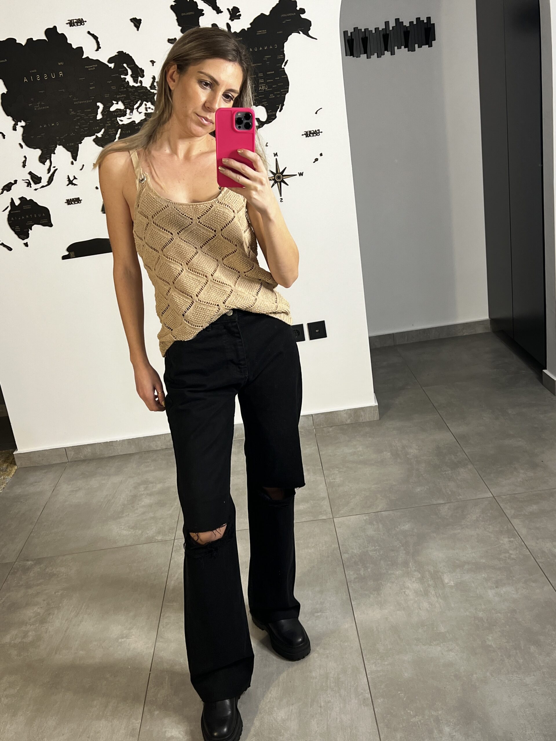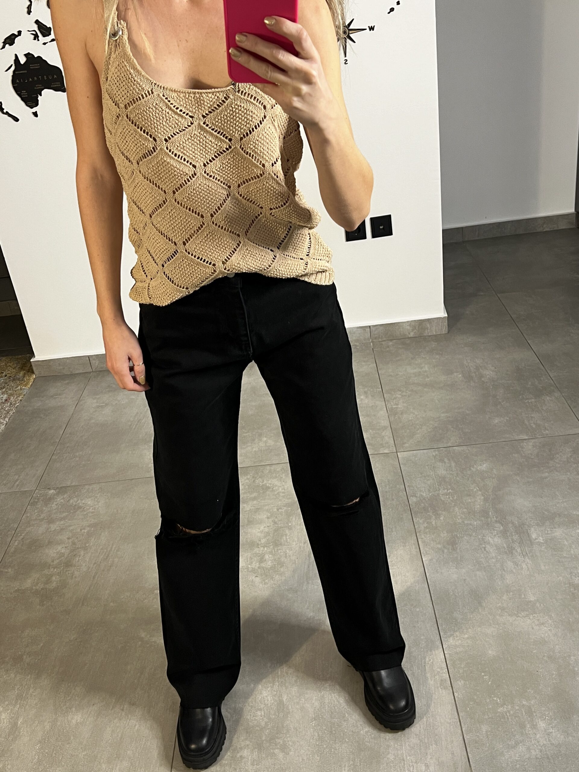 Πεντάτσεπο τζιν από μαλακό βαμβακερό denim με ψηλή μέση, κλείσιμο με φερμουάρ και κουμπί.Φαρδιά, ίσια γραμμή και σκίσιμο στα γόνατα.