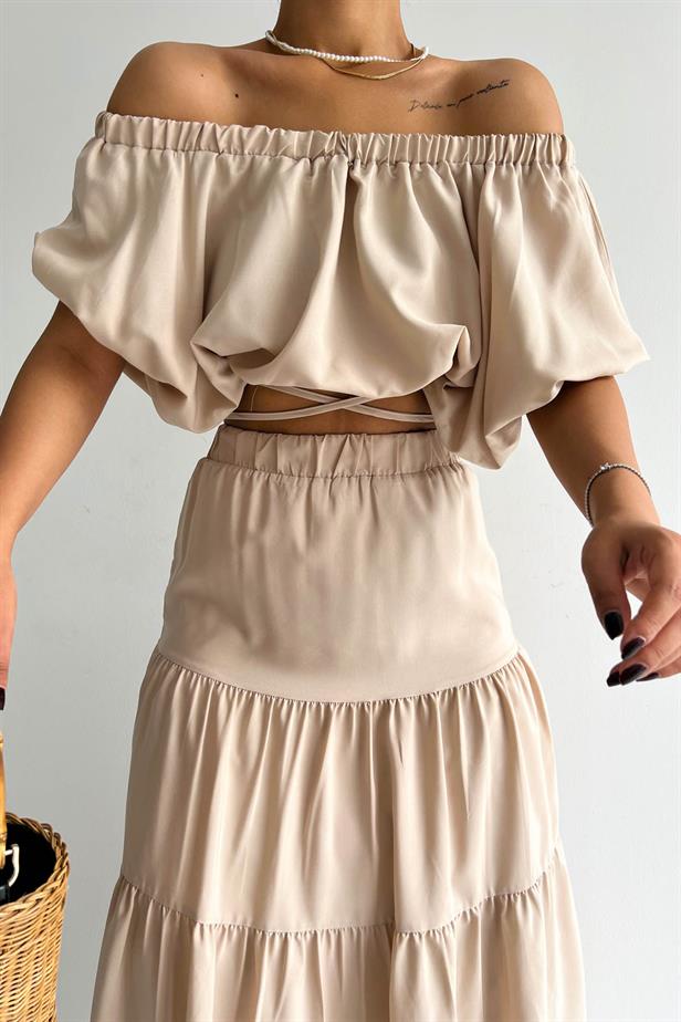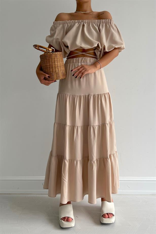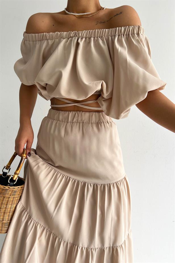 Φούστα μέχρι τον αστράγαλο με ψηλή μέση με ντυμένο λάστιχο, ραφή με σούρα και εβαζέ κάτω μέρος που δημιουργεί πρόσθετο όγκο και πλάτος.Τοπ με λάστιχο φουσκωτά μανίκια και κορδόνια που δένουν στη μέση.