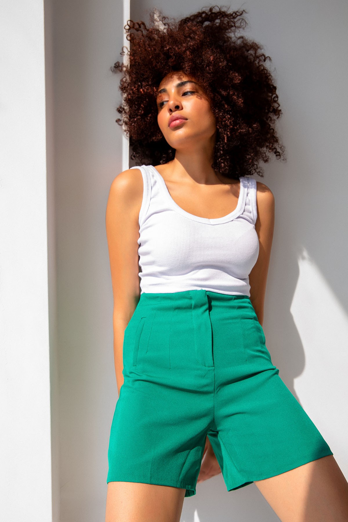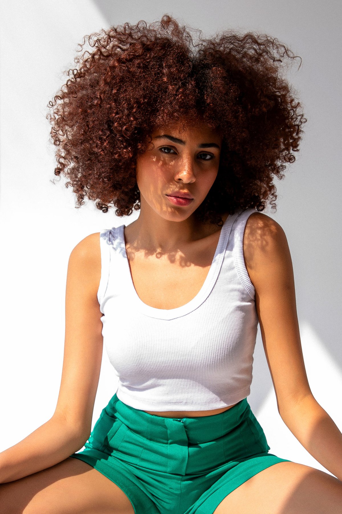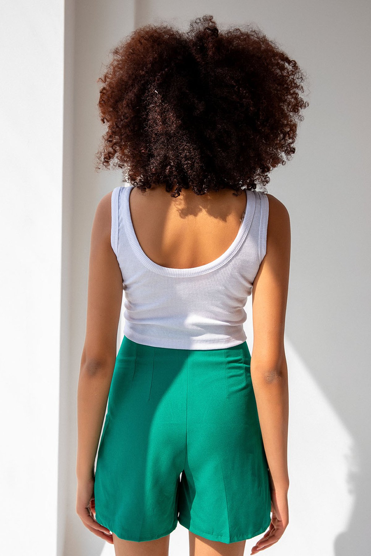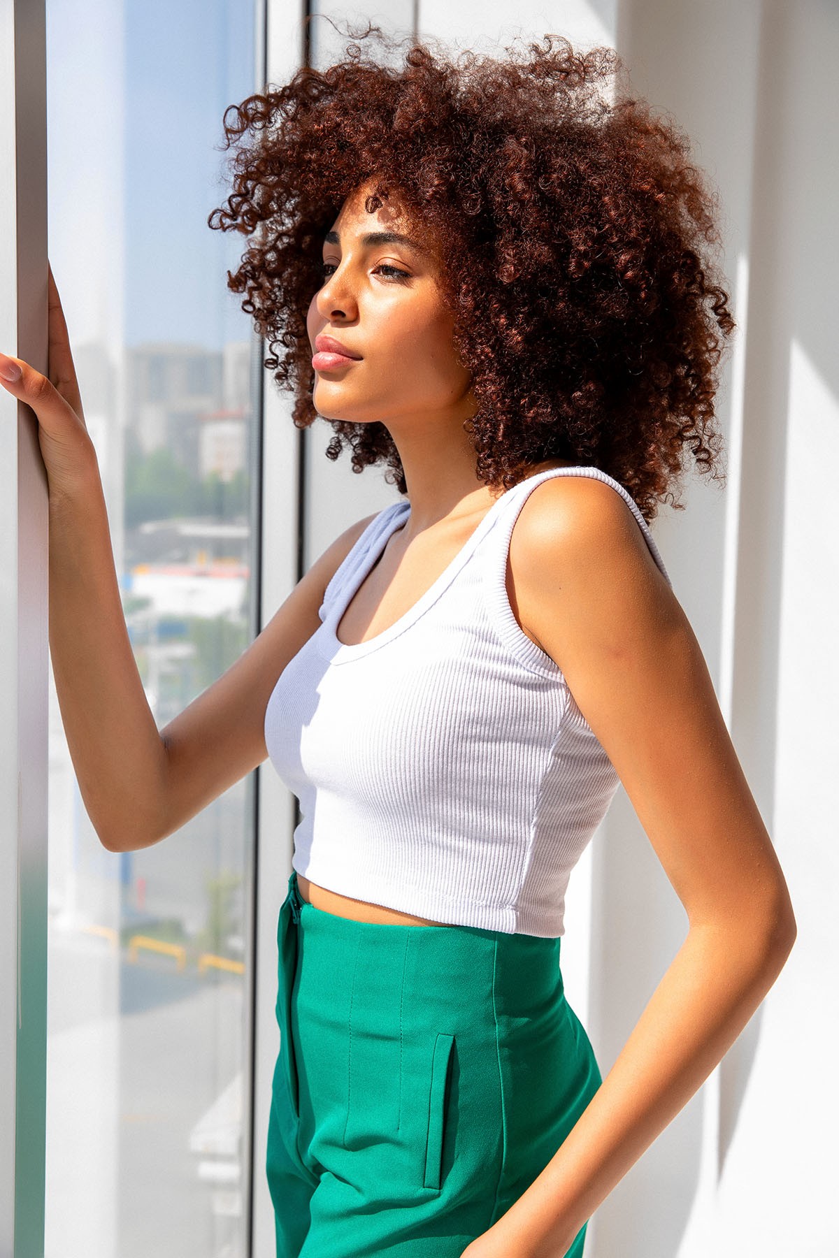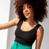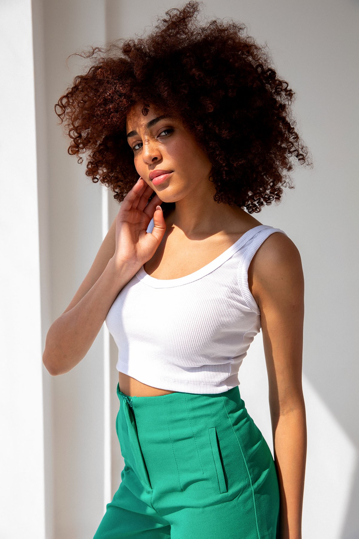 Cropped, εφαρμοστό top με πλέξη ριμπ. Βαθύ στρογγυλό ντεκολτέ με λεπτό τελείωμα.