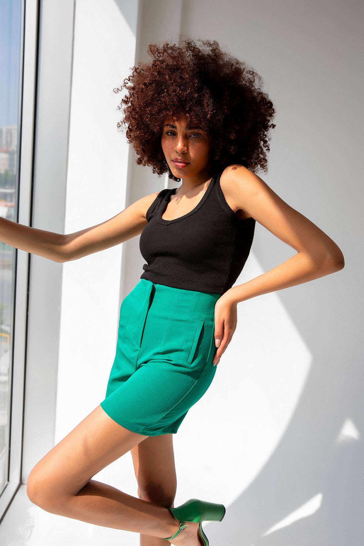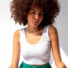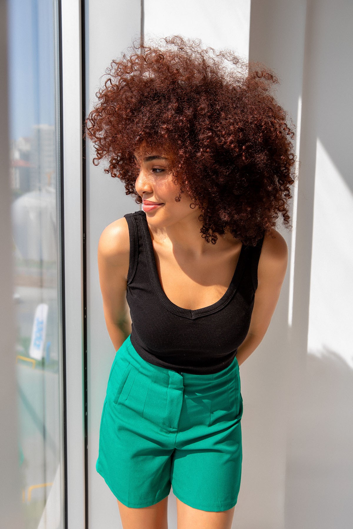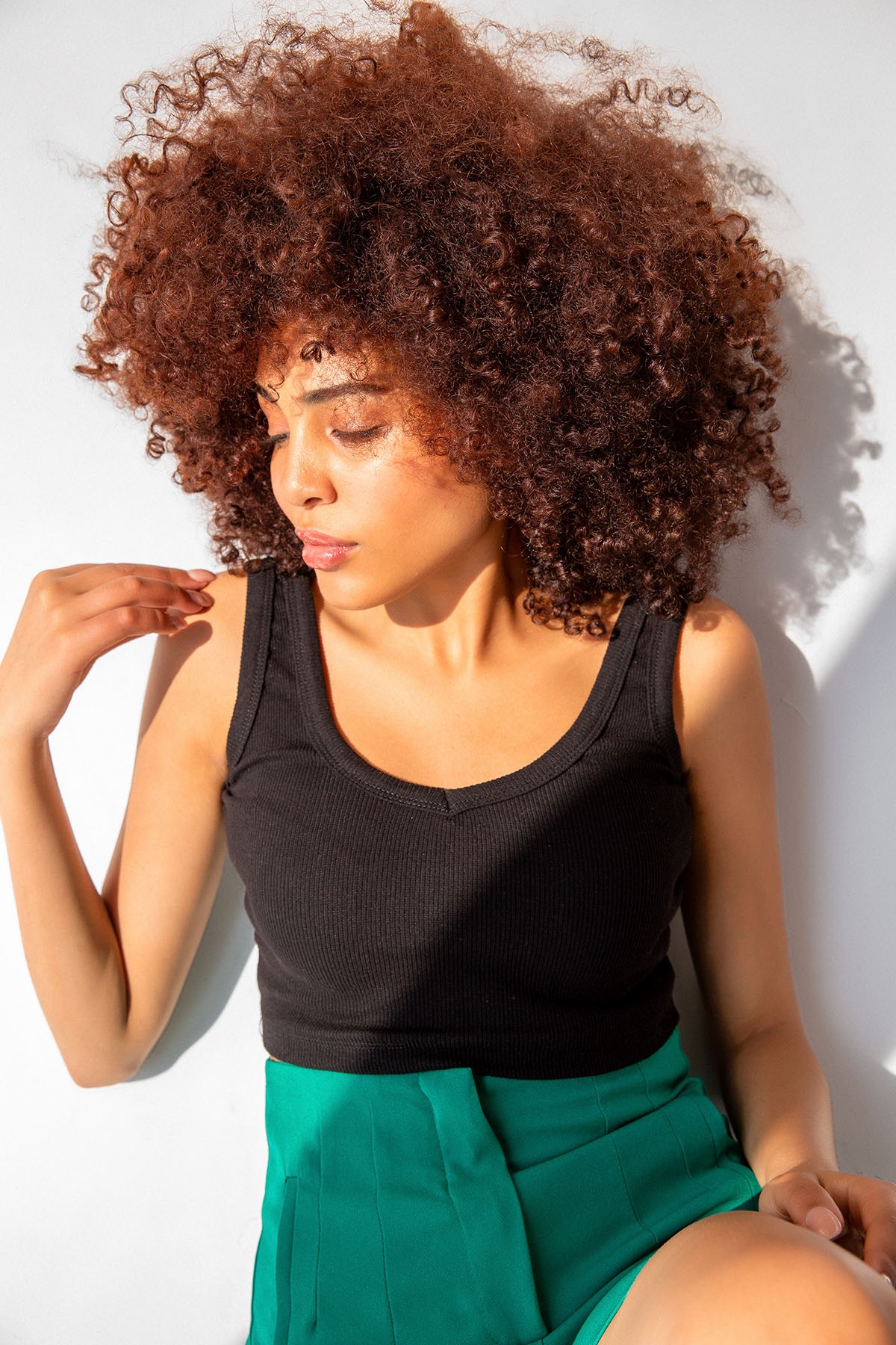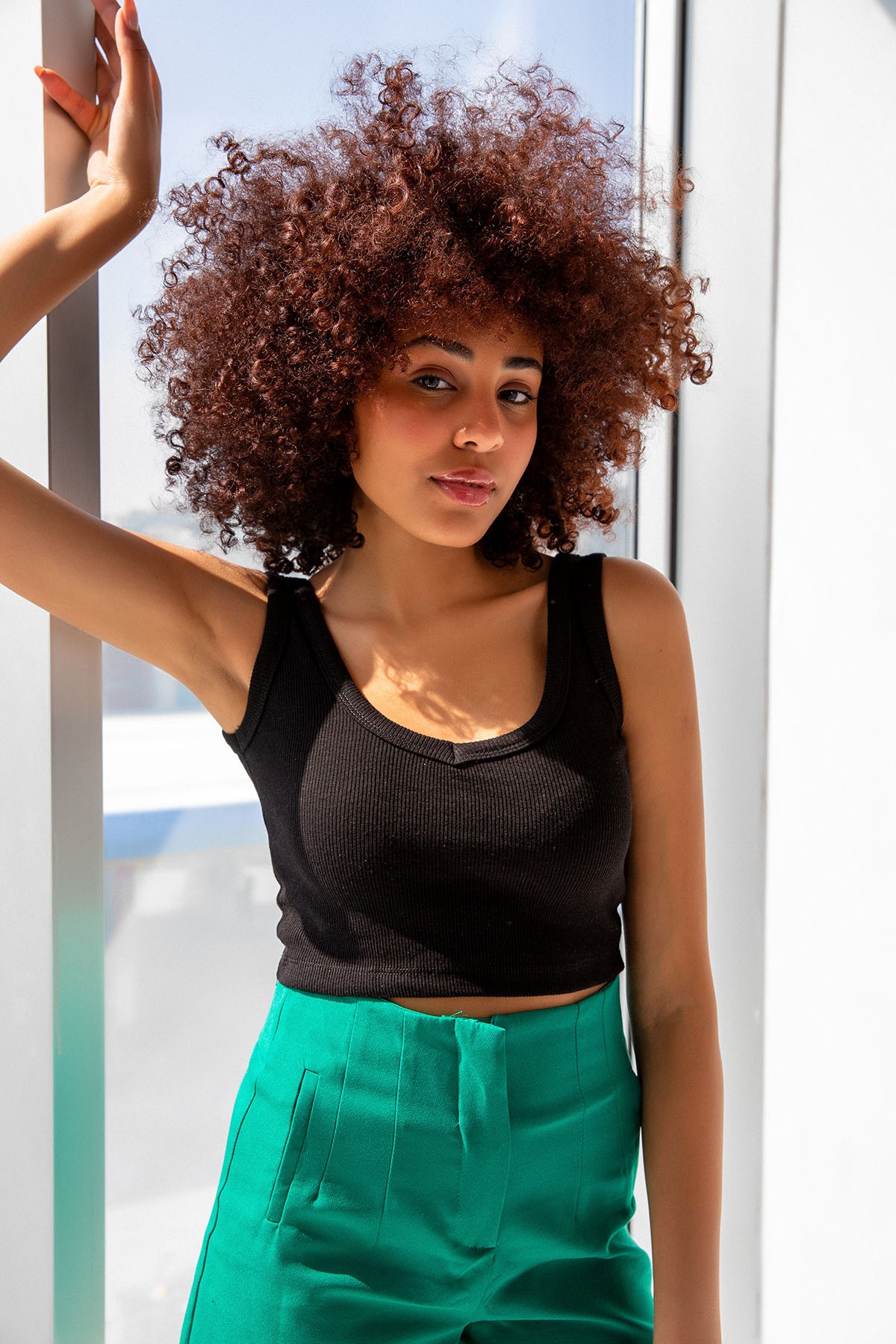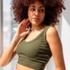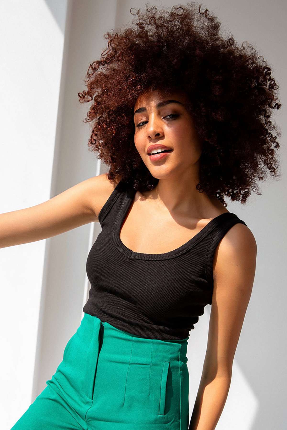Cropped, εφαρμοστό top με πλέξη ριμπ. Βαθύ στρογγυλό ντεκολτέ με λεπτό τελείωμα.
